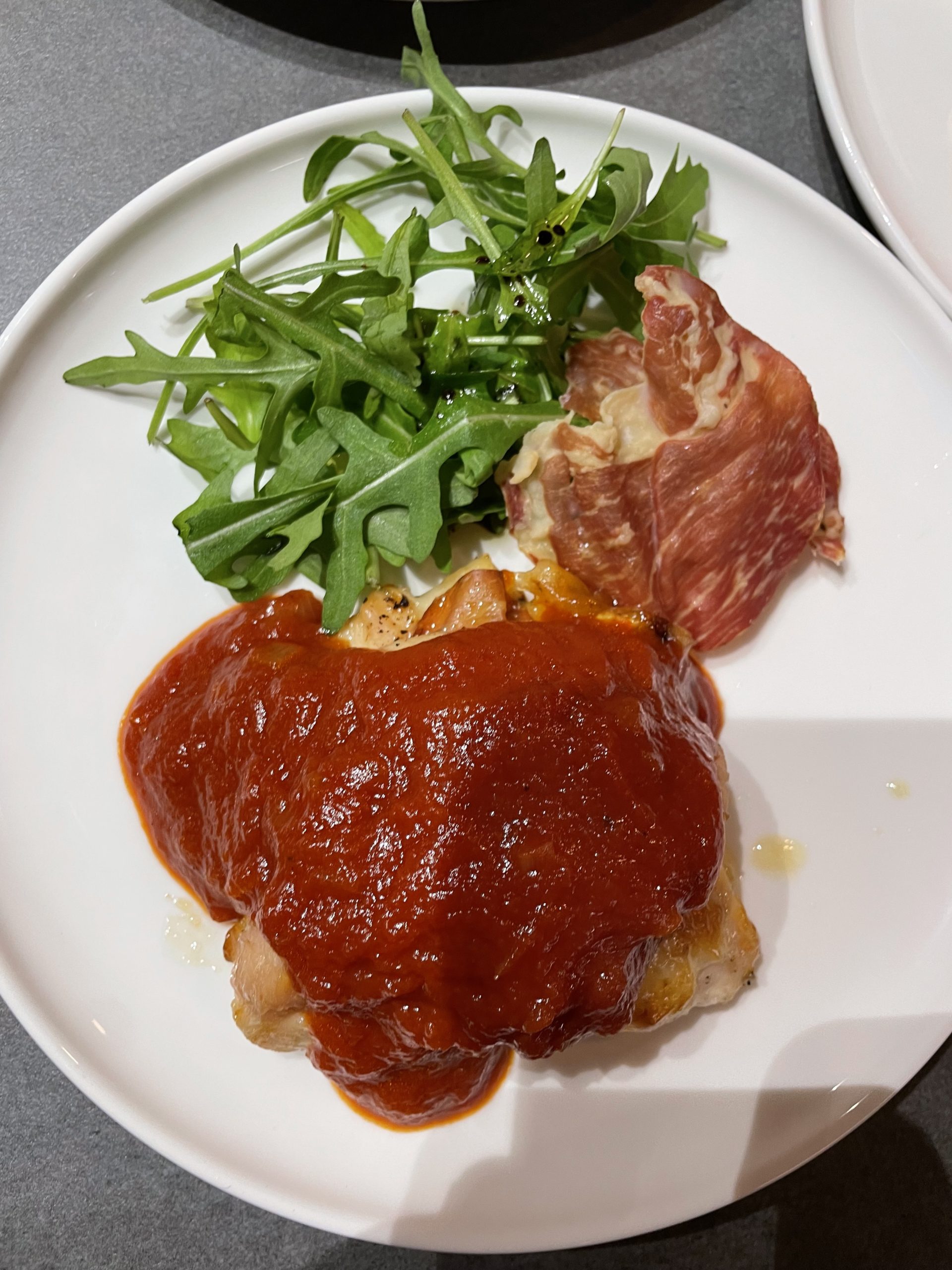 – Entrée : aubergines tranchées et grillées, mozzarella de bufflonne, basilic et sauce tomate